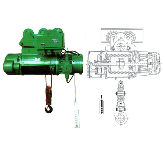 BCD型防爆鋼絲繩電動葫蘆主體可懸掛在工字梁軌道上作直線或曲線運行,或安裝在固定支架上,作為起吊重物之用。可以根據不同使用要求,同防爆單梁懸掛起重機或雙梁橋式起重機配套使用。
