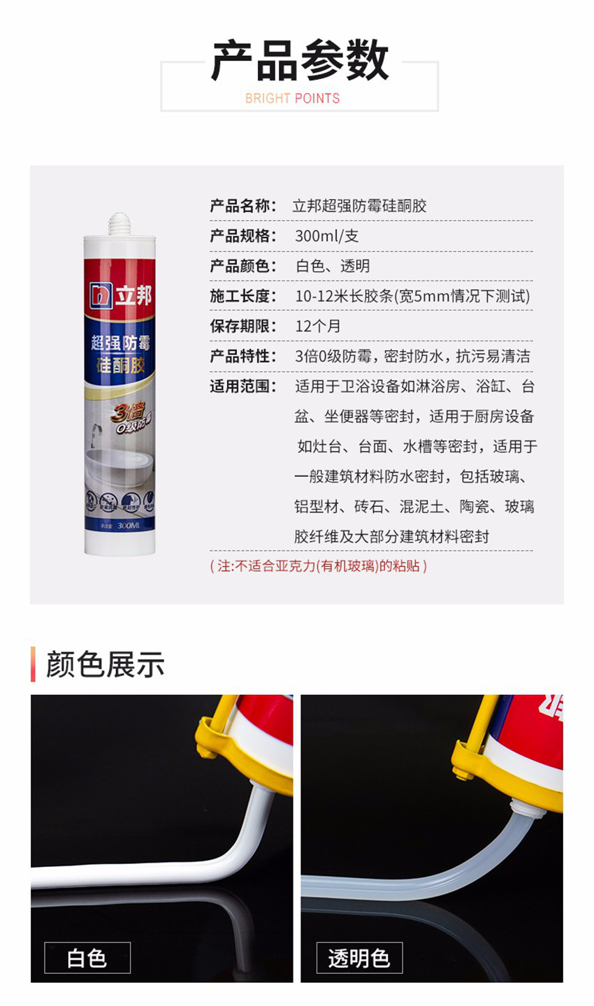立邦玻璃膠 原裝進口防霉密封邊膠硅酮膠中性膠防水收邊膠 透明款